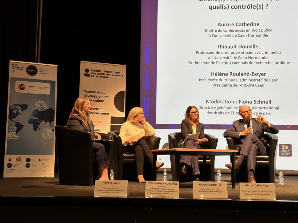 Mme Hélène Rouland-Boyer, présidente du tribunal administratif de Caen, Mme Aurore Catherine, maître de conférences en droit public à l’université de Caen Normandie et M. Thibault Douville, professeur en droit privé à l’université de Caen Normandie, ont pu échanger autour de la thématique « Les réseaux sociaux : quelle(s) responsabilité(s), quel(s) contrôle(s) ? ». Modérés par Fiona Schnell ; Directrice générale de l’Institut, ces débats ont permis d’éclairer le cadre juridique complexe régulant les réseaux sociaux au regard de l’actualité récente notamment. L’occasion d’expliciter le rôle de différents acteurs tels que l’Arcom, la Cnil et la DGCCRF, le tout au regard du cadre juridique européen. Un cadre dense qui doit composer avec des problématiques parfois contradictoires, entre liberté d’expression, protection des usagers et caractère polymorphe des acteurs de ces réseaux.