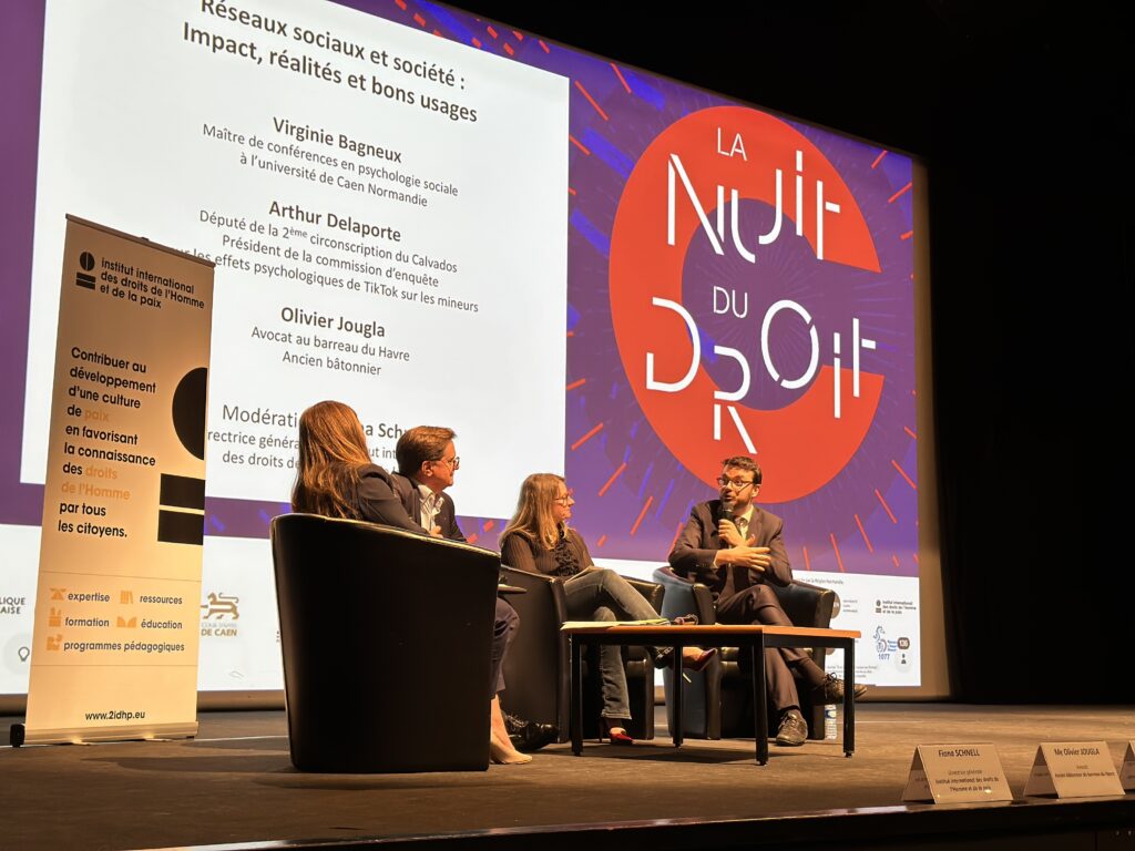 Au cours d’une seconde table ronde, M. Arthur Delaporte, député de la 2ème circonscription du Calvados, Mme Virginie Bagneux, maître de conférences en psychologie sociale à l’université de Caen Normandie et Me. Olivier Jougla, avocat et ancien Bâtonnier du barreau du Havre ont pu disserter, avec l’éclairage notable des résultats de la commission d’enquête parlementaire menée par le premier, centrée sur la plateforme TikTok. Un débat passionnant qui a permis de pointer les dommages psychosociaux pouvant être engendrés par ces réseaux (addiction, impact des fake news, enfermement social…). Tout en essayant de mettre en lumière les bonnes pratiques, nos trois intervenants ont également souligné l’enjeu et la difficulté de forcer les géants du numérique à se plier aux cadre légal et à agir de manière plus éthique sur ces questions.